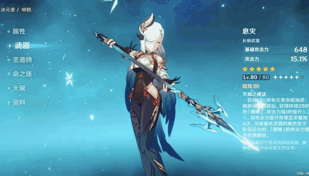 五星武器的部分首要推荐申鹤专武息灾,可以获得12%的全元素伤害加成,同时20秒内可以攻击力%数提升,最高可以叠满六次,处于后台状态下攻击力提升效果还翻倍,虽然被动效果十分香,但武器抽取成本也高,若是没有办法抽专武的话也可以选择和璞鸢,被动效果也能够提升攻击力%数,最多叠加七层,同时副属性提供的暴击率也算实用,整体效果和息灾大约差距10%左右,常驻池也有机会抽到,也算是可以考虑使用的武器。总之在选择武器方面尽量选择以攻击力%数加成的为主,其次可以选择元素充能效率的为主,但就会有明显落差。