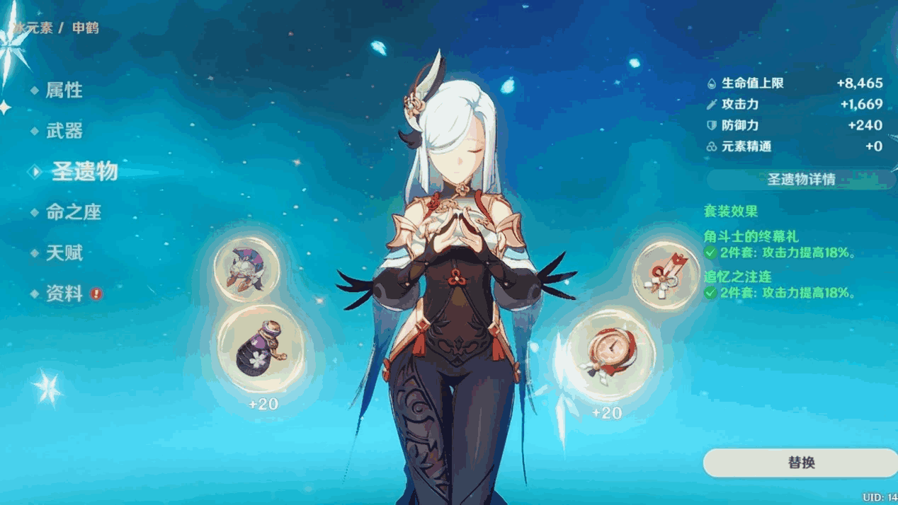 然后是圣遗物部分,申鹤如果作为副C打伤害的话,最佳选择是追忆角斗2+2,这套圣遗物是将冰翎增伤最大化的套装。纯辅助可以选择4宗室,开大后的全队增伤20%也能替冰翎增加伤害,但由于宗室4件套效果不能叠加,如果队伍中有其他4宗室的话就不推荐这套。