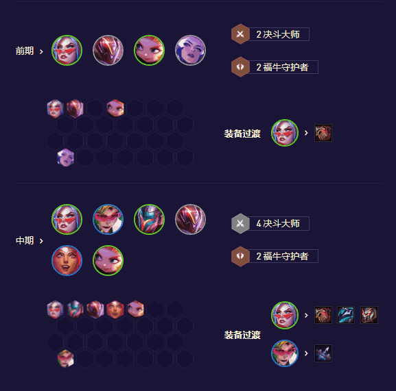 直接决斗体系牌过度,优先拿剑姬的肉装。2-1和3-2要拿到剑姬的英雄强化就可以冲,没有就转高费运营阵容。