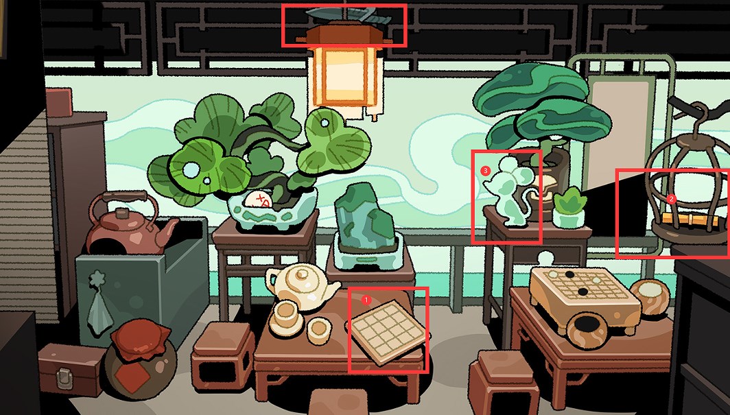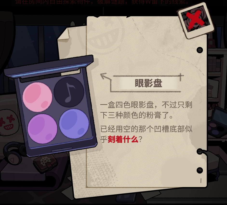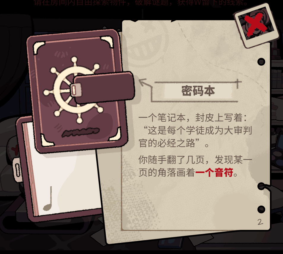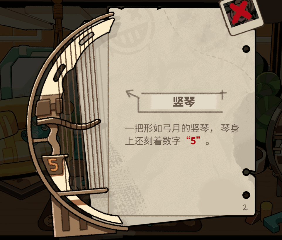 如下图所示的四个位置,最左边的留声机是密码箱,按照另外三个物件右下角的页码顺序填入音符即可。