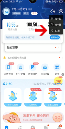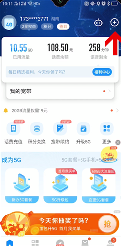 - 打开手机电信营业厅,在首页上点击右上角的+号,