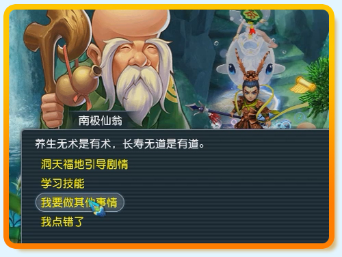 与长寿村107,192(靠近方寸山的台阶下)南极仙翁对话开启剧情。