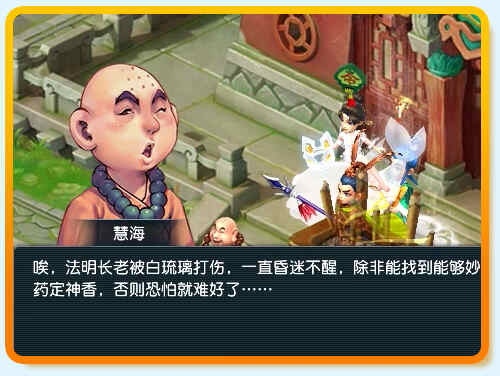 - 与化生寺110,81空慈方丈对话。2.前往大唐国境30,158与白琉璃对话,进入战斗。奖励:剧情点:1、经验:40000、物品:40级衣服。3.与化生寺110,81空慈方丈对话。4.与华光殿内23,16法明长老对话。5.与化生寺52,37慧海对话。6.与花果山125,80侯医仙对话,给餐风饮露。