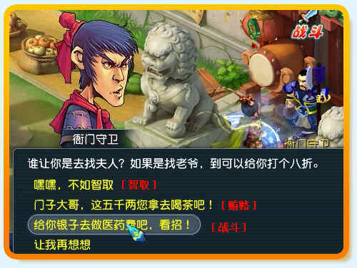 选择“给你银子去做医药费吧,看招!”进入战斗。