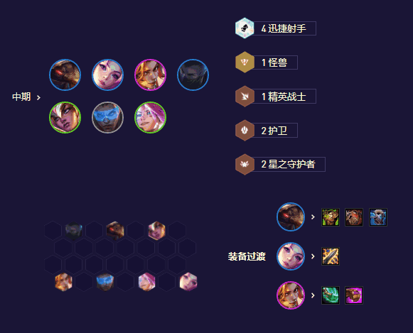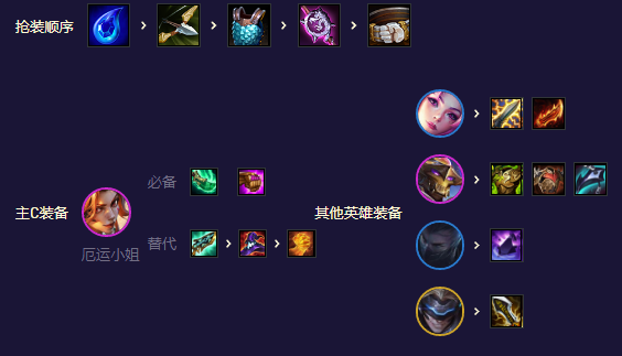 射手女枪的大招伤害很高,公理圆弧珠光保证技能伤害和频率,通用的战力海克斯都能拿。英雄强化就拿体系牌的团队强化。