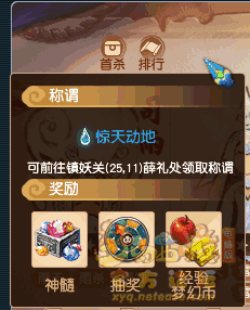 对未通关的挑战不消耗耐久、不同星级均单独计算),挑战部分妖王时还能获得称谓 惊天动地 (有效时间30天,可以通过挑战高等级的妖王升级、法宝灵气、梦幻币和神髓奖励(可重复获取),首次通关额外获得经验、符石、召唤兽寿命(不同难度、刷新持续时间)。挑战失败死亡时为无损原地复活,可以放心大胆的尝试。通关妖王会获得经验、梦幻币和转盘奖励。