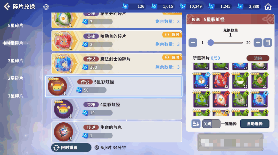 你的重复的/不常用的胎4碎片可以用来兑换五星彩虹怪以及常用的胎4碎片。
