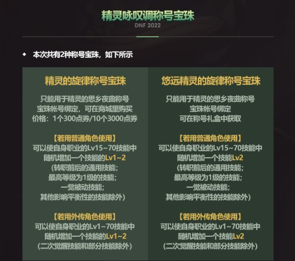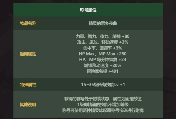 1级即精通的技能不增加等级,称号可使用两种精灵咏叹调称号宝珠进行附魔。
