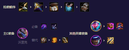 狼人春哥必备,其他ad装备捡垃圾都可以,铁男带法强装或肉装捡垃圾也可以,卡牌带电刀减魔抗。若是铁男装备满了或者卡牌先2星,可以把法装先给卡牌。