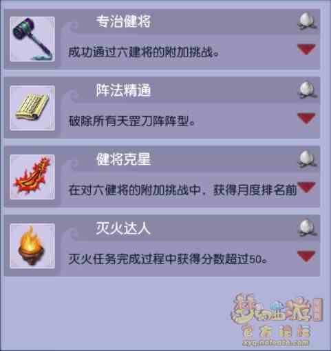 所有相关成就如图所示,其中原“鉮渏的聚水珠”成就改为“灭火达人”,但完成进度不变,无需重复完成。