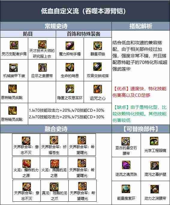 【配装特点】结合低血和攻速的兼容搭配,由于相关部件经(jing)过(guo)加强,强度特别不错,并且搭配恩特鞋子的70特化形成超強武莲华