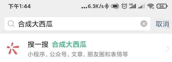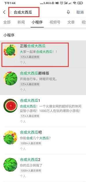 在微信软件(software)的搜索(suo)框中,选择(ze)小程序(xu)输入(ru)“合成大西瓜”;