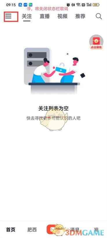 1、打開抖音火山版,进入到首页(shouye)と後点左上角的【三横】图标(tubiao);
