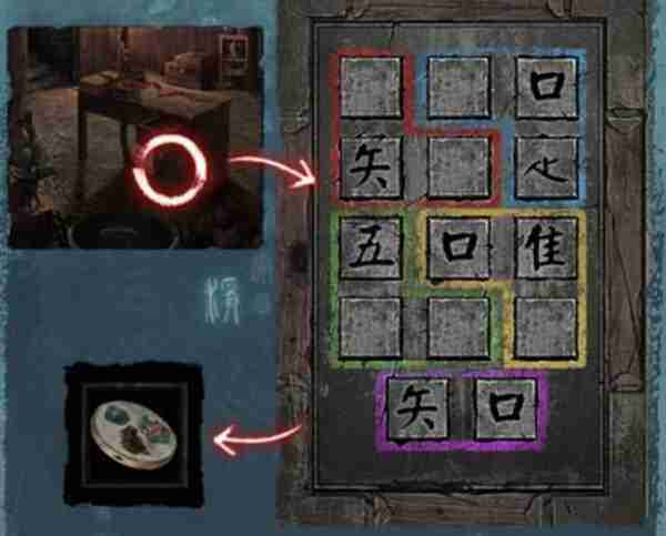 15、从杂物间出(chu)来(lai) 点击桌子 查看桌子上镶嵌看的古钱币 根据祭台下方、杂物间、桌子上线索输入密码 岀现刺绣 放入断箭 获得团扇