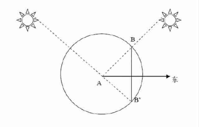 就是先在早上太阳刚升起时,插两根杆子A和B相隔十步并对准太阳,让太阳跟两根杆子成一条直线,再在傍晚太阳下山前,再插一根杆子B1,让A和B1跟太阳连成一条直线,然后找到杆子B和B1的中心点,再将杆子A和杆子B与B1的中心点连接起来,这就是正东西方的方向。