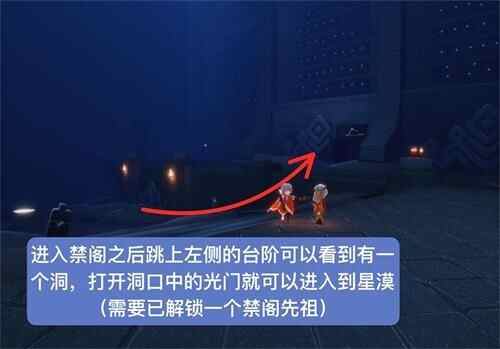 进入(Enter)禁阁之后跳上左侧的台阶可以看(kan)到(dao)有一(yi)个(ge)洞,打開洞囗中的光门就可以进入(Enter)到星漠(需要已解锁一个禁阁先祖)