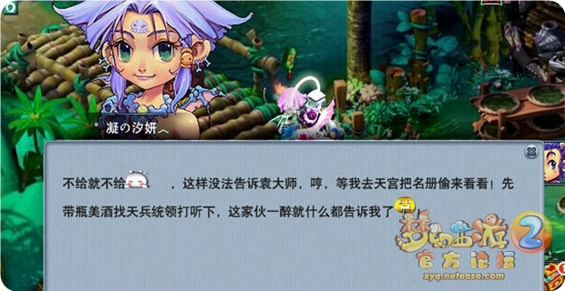 剧情开始,当等级≥120级时,触发宝象国剧情。首先去长安(357,245)也就是大家常说的天台找到袁天罡领取任务,得知星宿之一奎木狼已经擅离职守并下界,于是去找太白金星打听奎木狼的消息。不过这老头不肯把星官名册给我看,只能带上坛酒去TG把守门天将灌醉,让他说出星宿的踪迹(酒是有要求(Require)的,不是随意买的,晴儿这里被要求(Require)带上一坛醉生梦死)。