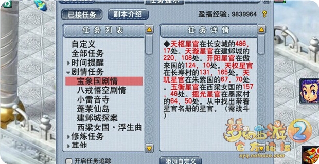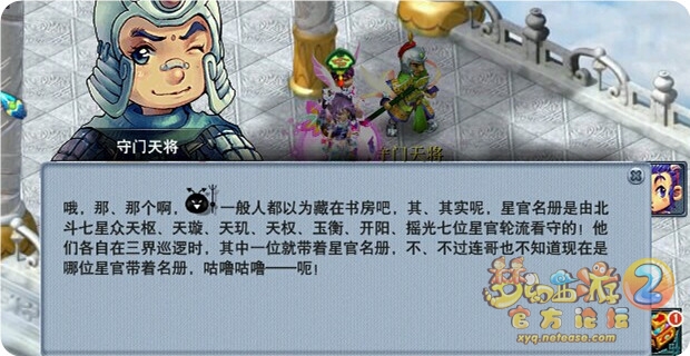 【小贴士】这里大家可以准备7个天眼通符,因为守门天将不会直接把各星宿的位置告诉你的。用了天眼后,任务栏就会出现所有星宿的坐标。战斗很简单,只有1款怪,气血9999这样,战斗结束没有经验奖(jiang)励。