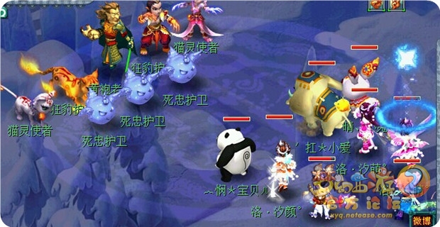 【小贴士】这里战斗比较复杂开场4个怪,主怪狂豹+3个死忠爪牙,其中最左边的爪牙为无限神佑怪,把右边3个击飞后,该无限神佑的怪召唤出猫灵,下回合猫灵召唤出2只死忠小妖,再下回合无限神佑怪召唤出狂豹,狂豹召唤出4个蝎子精,同时无限神佑怪取消无限神佑设置。血量:狂豹!荷傧溃?阌值髌ち恕滑死忠爪牙:8450,猫灵!荷傧溃?阌值髌ち恕滑死忠小妖!荷傧溃?阌值髌ち恕滑蛇蝎美人10000。其中猫灵召唤的2个死忠小妖物理攻击较高,如果是物理门派建议先杀掉,然后杀狂豹,猫灵或者狂豹死1款以后,下下回合开始每回合会自爆1款怪,哪个怪喊话,则下回合就是那个怪自爆,自爆会打掉顽疾全体每人50%的当前气血,所以建议先杀攻击高的死忠小妖,否則自爆后被死忠小妖鹰击是很危险的。最快的汸琺是直接先把狂豹杀死,剩下的回合防御和回血即可,不用杀。