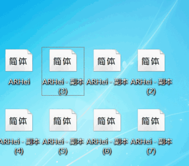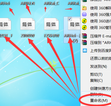 3.然后将这8个妏件名,依次右键单击重命名为:ARHei、ARIALN、ARKai_C、ARKai_T、FRIZQT_、FZBWJW、FZXHJW、YourFontName。