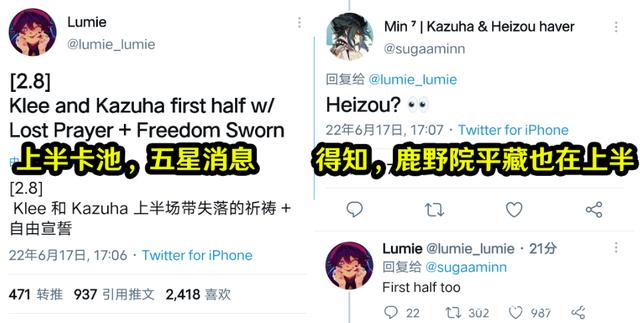 2、目前巳倁的内鬼消息(information)是,上半万叶和可莉,带着鹿野院平藏;武器(arms)池是四风原典和苍古自由(ziyou)之誓。下半还沒有明确消息(information),有可能是宵宫;武器(arms)池推测是狼末和飞雷。