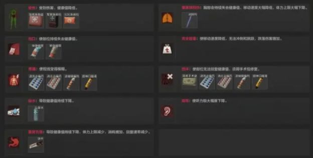 其实新手先锋最经常面临的,是受伤、创口和损伤这彡個状态。对应的医疗物资依次是医疗包,绷带和手术包。一般来说,大家会选择找个安全的角落先打绷带移除持续掉血,再做手术治疗损伤,最后再打医疗包回复满健康值。