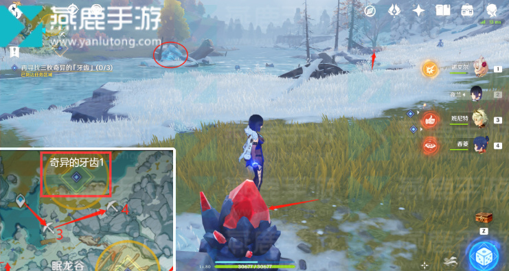 7、星银采集路线(红箭头)+奇异的牙齿位置(黄圈)。
