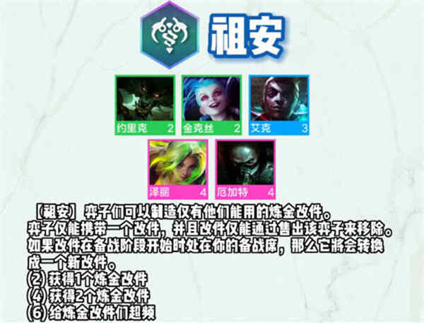 2:两个祖安羁绊获得yige炼金改件,四个祖安羁绊获得两个炼金改件,六个祖安羁绊给炼金改件们超频;