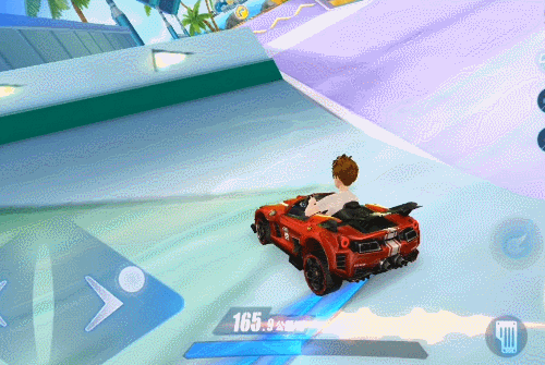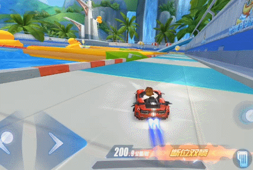 这里只要通过两个绿色台阶(两个台阶并不是直线,行驶时要微调方向,如果在台阶处掉落(luo)水中会进入远程赛道),然后小喷进入正常赛道即可。为了避免速度过快掉入水中,可以不使用氮气。第二圈时如果氮气足够且对自己操作有信心,也可使用氮气加速通过。