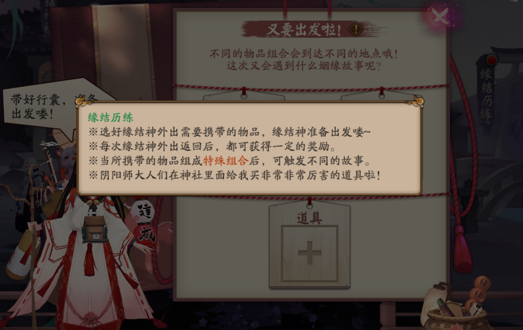阴阳师缘结历练道具组合全览(阴阳师缘结神获得方式)在里面玩家要搭配自己的道具组合才能解锁一些奖励,还有更多内容大家可以往下看。