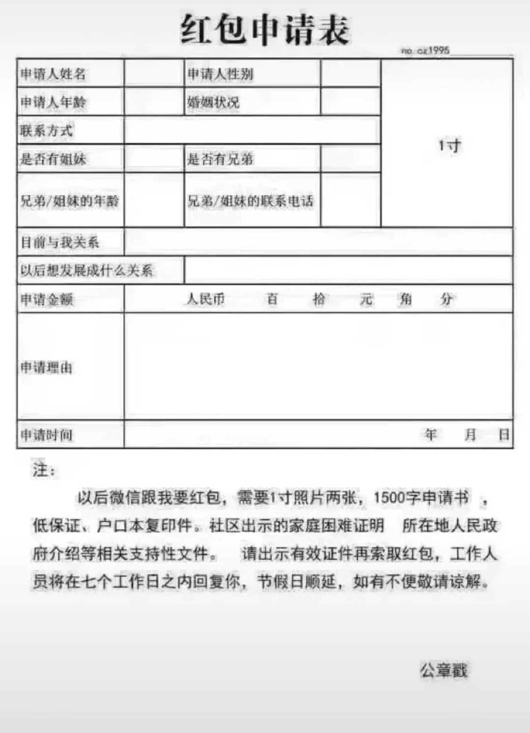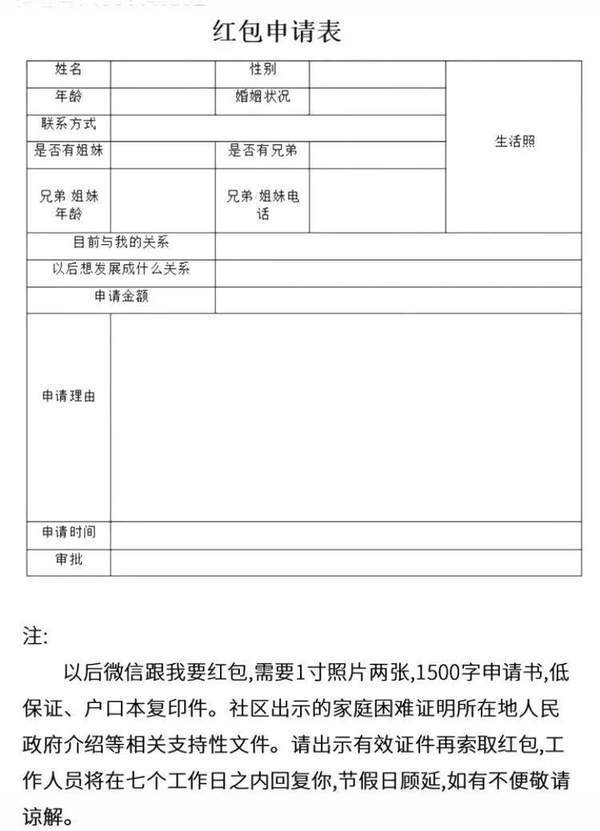 注:以(yi)后微信跟我要红包,必须填此表,需一寸照片2张,300字申请书,身份证,户口本复印件,社区出示家庭困难证明,所在地人民政府介紹等,相关(relevant)支持性文件。
