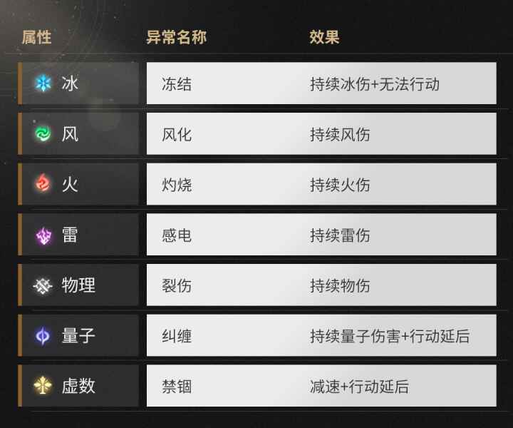 在星铁中,我们可以通过弱点属性(Attributes)击破敌方的韧性条,造成击破伤害(shanghai)并附加减益效果。根据角色属性(Attributes)的不同,破韧也能够产生不同的减益效果: