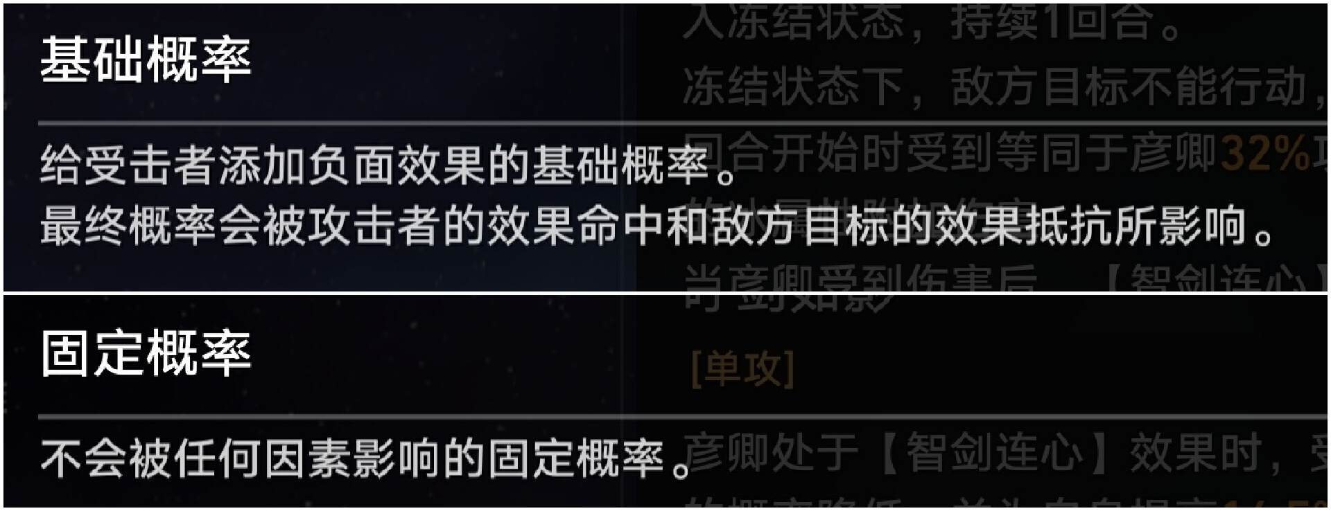 首先在星铁中,有“固定概率”与“基础概率”之分,固定概率不会被任何效果影响,而基础概率则可以受到我方的效果命中及对方的效果抵抗影响。