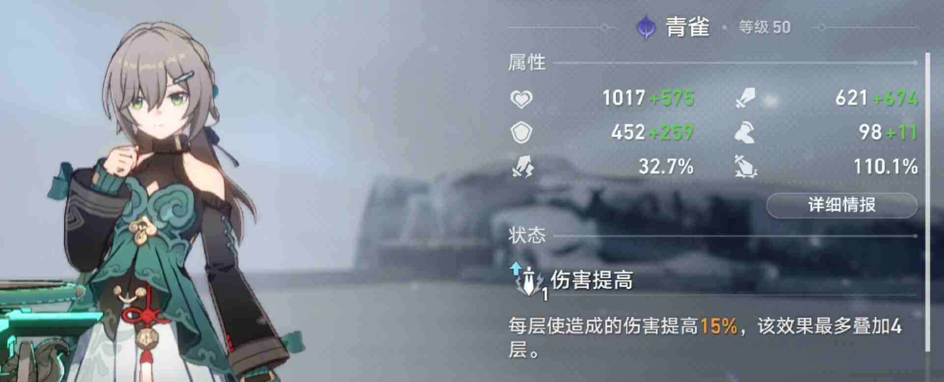 星铁中各种方式提供的伤害(shanghai)加成都属于伤害(shanghai)属性(Attributes)这一乘区,做加法运算。因此除了角色自身的行迹、遗器、光锥等提供的加成外,战斗中角色被施加BUFF后,也能够在面板中查看。例如青雀的战技“海底捞月”能够提升(tisheng)自身伤害(shanghai),反映在面板上,就是所有属性(Attributes)的伤害(shanghai)提高都增加一定数值。