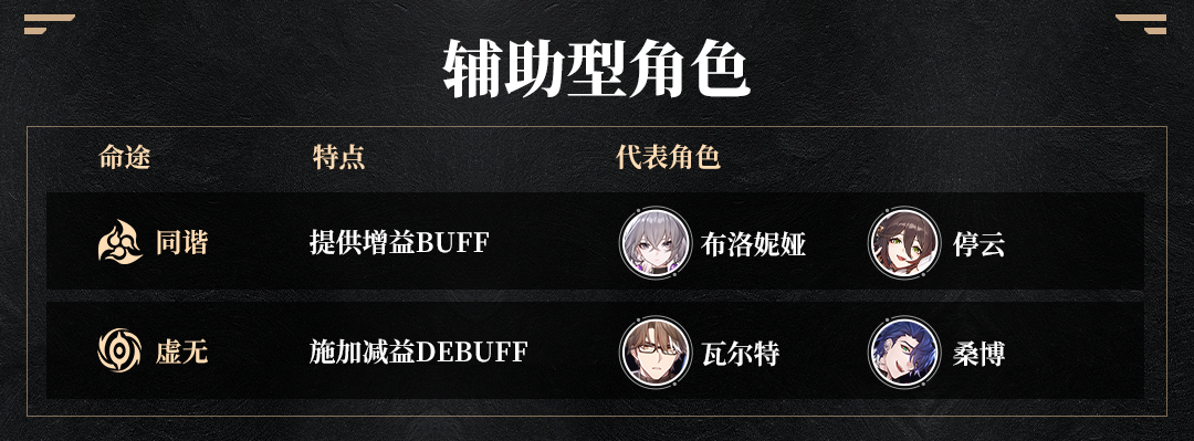 辅助型角色,主要指同谐与虚无命途的角色。前者注重于为我方提供增益,后者则注重于对敌方施加减益。部分辅助型的角色在辅助队伍的同时,还可以为队伍补充伤害(shanghai)。
