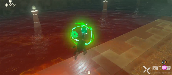 1、进入神庙,使用究极手将小球按入水中,松手即(ji)可(ke)反弹上来击中开关,打开侧门。