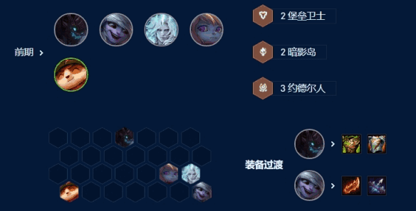针对1费、2费卡为主C的阵容。2阶段可不升级。前期只拿目标(Target)英雄,可(ke)以(yi)考(kao)虑打连败,在3-1四人口冲刺D牌,将所有体系(xi)卡搜到2星及以上(yishang)。1费卡核心阵容,且来牌较顺则可(ke)以(yi)把钱花完搜卡。之后稳血养经济,使用利息搜其他牌三星或者升人口补充更多羁绊和英雄。