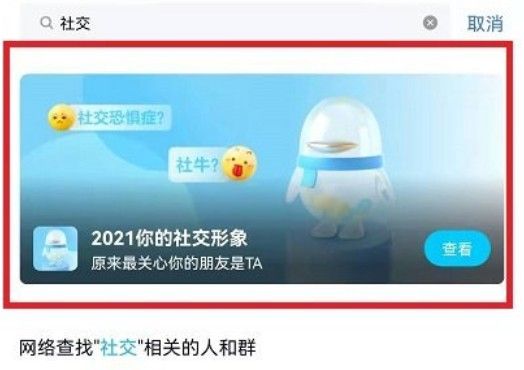 首先要进入QQ,在首页的搜索框中输入【社交形象】,这(zhe)样(yang)就會出现一个活动版块,就是下面红色框框圈住的这个(this)版块,这就是年度报告的入口(kou),點击进入即可(can)了解到自己在2021年通过QQ的各种操作详情。