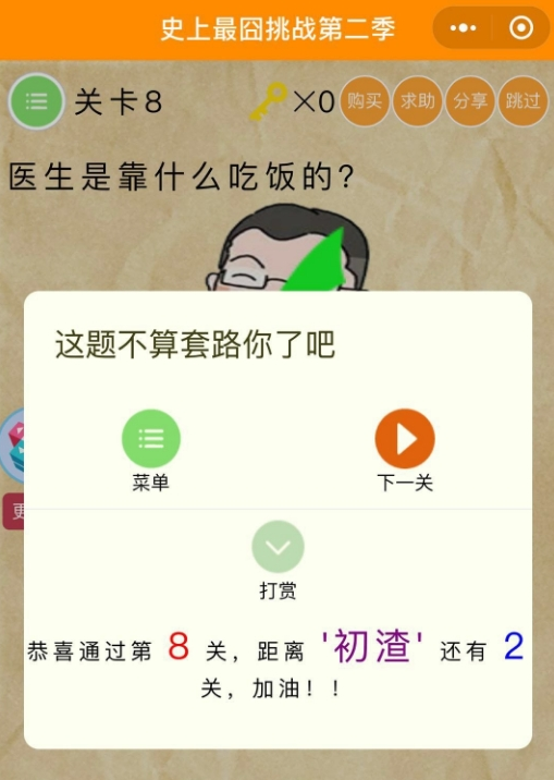 医生靠嘴吃饭,玩家们只需要点击医生的嘴就可以顺利通关了。最囧游戏都是这种无厘头的模式,玩家们不可能以正(zheng)常的思想去寻找(Look for)题目的正确答案