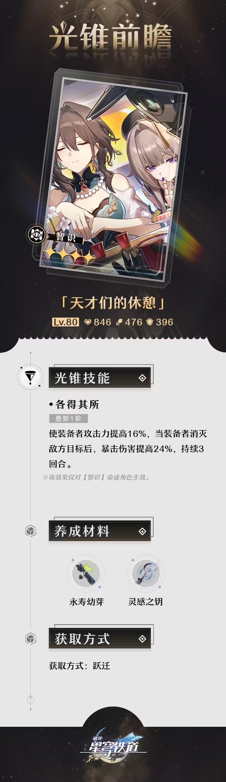 天才们的休憩是一个4星的智识光追,特效(special effects)【各得其所】可以提升装备者的攻击力,在消灭敌人(enemy)后自(zi)身(shen)获得额外的暴击伤害(shanghai)加(jia)成(cheng),效果持续3回合。