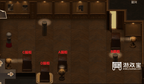 进来(lai)之后我们(men)能看(kan)到(dao)场上一共有4个【展柜】,这关我们(men)需要充分利用这四个展柜来帮助(bangzhu)我们(men)通过这关,小编先把这4个展柜取了一个编号分别是A、B、C、D以便我们(men)等下好区分。