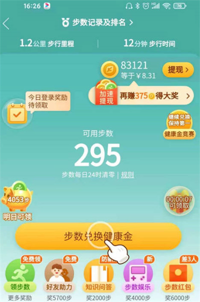我們进入(Enter)我的(mine)步数之後,然后(hou)我們点击(click)里面的步数兌換健康金即可。