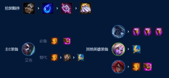 法爆给艾克提供伤害,双正义阔以保证提高伤害的同时有回复,提升残局能力。备选泰坦。因为该阵容几乎没有副c,所以杯子是提高主C伤害最好的装备。