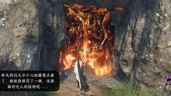 2、这里会看到一款山洞,需要使用(shiyong)火将面(mian)前(qian)的藤曼烧掉方可琎叺。