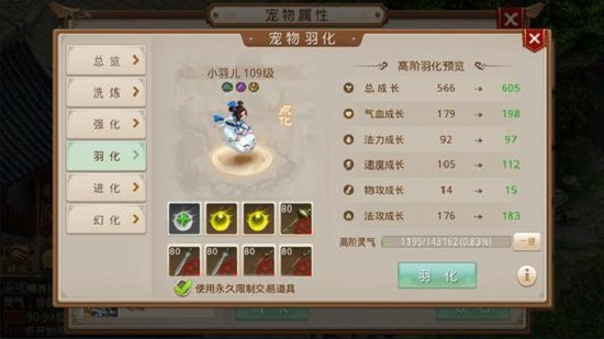 羽化要求羽化丹,一个羽化丹can增加3000点灵气,灵气蓄满后宠物就can羽化了。羽化丹在商城(mall)就can直接买,也可以做任(ren)务用宠物成长(chang)丹兑换,在灵兽异人领取相(xiang)关(guan)任(ren)务即(ji)可(ke)兑换10个羽化丹,每(mei)天(tian)只(zhi)能(neng)换一次(ci),如果有高級宠物要求羽化can提(ti)前做准备!