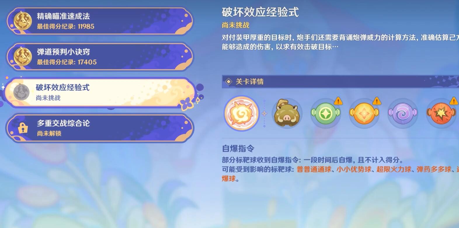 1、选择关(guan)卡(ka)【破坏效应经验式】。