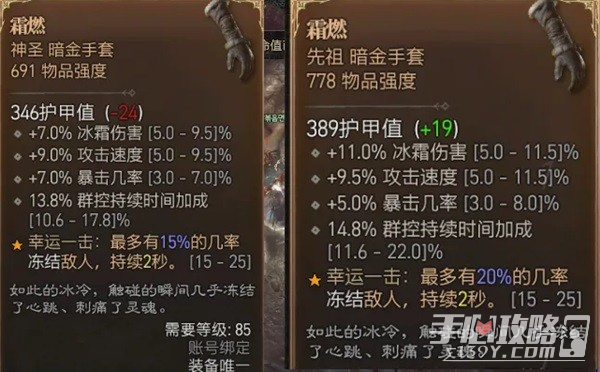品质越高,装备的基础属性和词缀的上下限就越高,普通的手套技能等级最多+2,神圣级别最多+3,先祖就能+4。暗金装备词缀固定,但品质会影响词缀的区间。