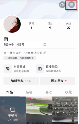 1、打開抖音APP,在我(wo)的(de)界(jie)面(mian)點击右上角的三横图标。