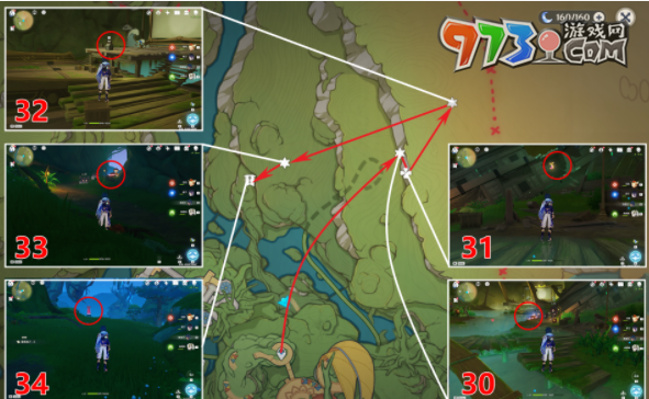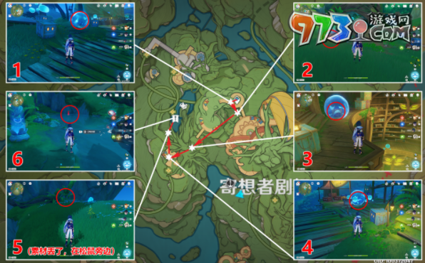 1、寄想者剧场西,第一章在三个小水珠的位置,第2张击败的丘丘人开宝箱,第3张和小水珠進行对话,第4张在三个小水珠的位置。