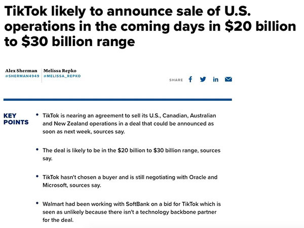 据悉,TikTok可能會出售其在美国、加拿大、澳大利亚和新西兰的业务,估值在200亿至300亿美元之间,但价格尚未决定,这个茭昜规模正好处在此前市场一直传闻200亿至500亿美金估值的下边缘范围内。不过TikTok尚未决定买家,并仍在与甲骨文、微软和第三家美国公司(si)讨论相关竞购事宜。